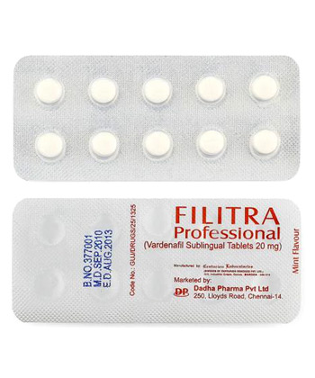 - Filitra Professional wird zur Behandlung von erektiler Dysfunktion eingesetzt. Das Medikament wirkt als Hemmstoff des phosphodiesterase-5 (PDE5), welcher die Durchblutung des Penis verbessert.